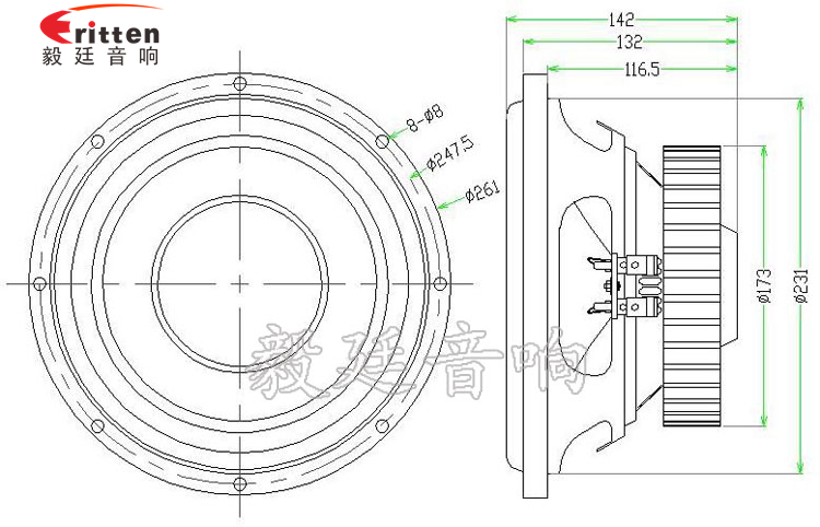 采用泡邊紙盆,50芯銅線音圈,紙盆是復合松壓盆,設計新穎,阻尼效果好,音質清晰;